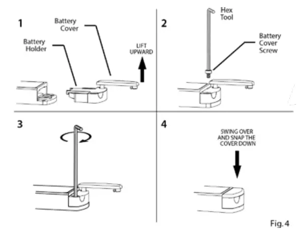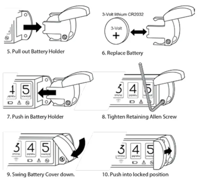 Check that the battery is properly inserted into the holder. The “+” surface of the battery should be inserted into the holder against the surface of the holder marked with the “+” symbol. Insert the battery holder into the lock with the holder cover in the fully open position and with the battery holder screw flush to the bottom of the holder until the holder is fully seated. Next, use the hex tool to fasten the battery holder screw into the lock body. Last, swing the battery holder cover to the closed position, push in and fully seat the cover into the battery holder until it is flush to the lock body.