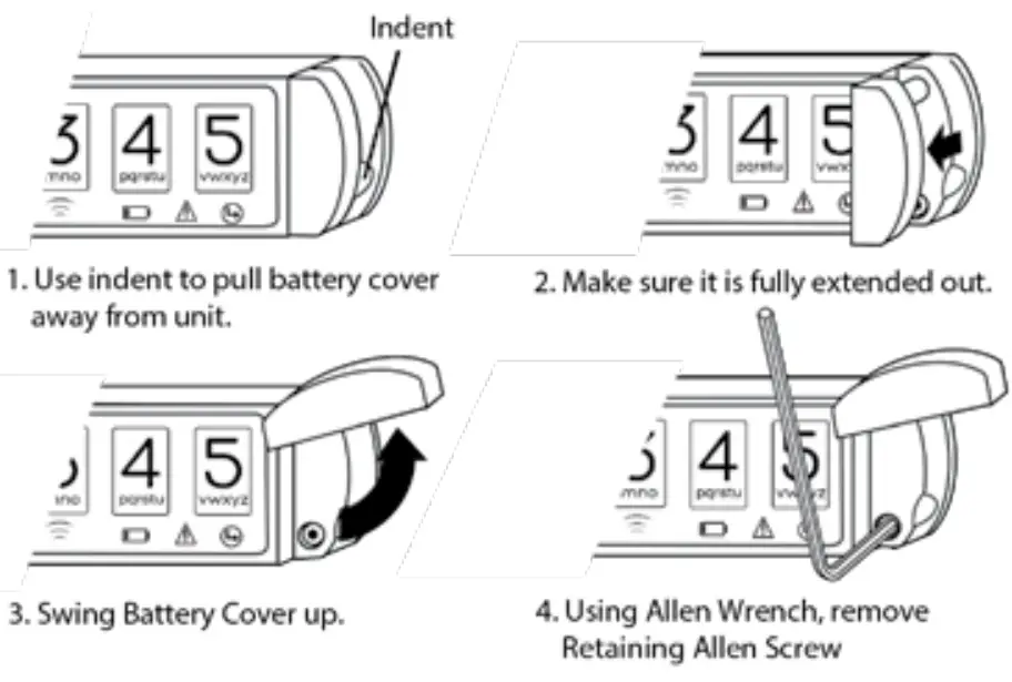 After installing the lock the mounting surface, the battery and holder can be inserted into the lock. The cover for the battery holder also serves to lock the holder into the lock housing. The battery cover must be in the fully open position before inserting the holder. The battery holder screw cannot be protruding from the bottom of the battery holder, it must be flush with the holder so the holder can be inserted.