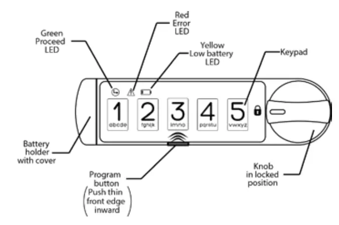 To determine which operating mode the lock is in, remove the battery, press and release the program button, and reinsert the battery. Note the color sequence of the LED flashes when the battery is reinserted: