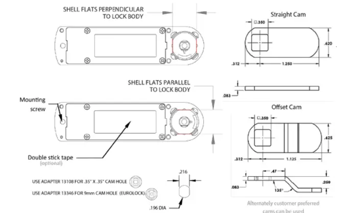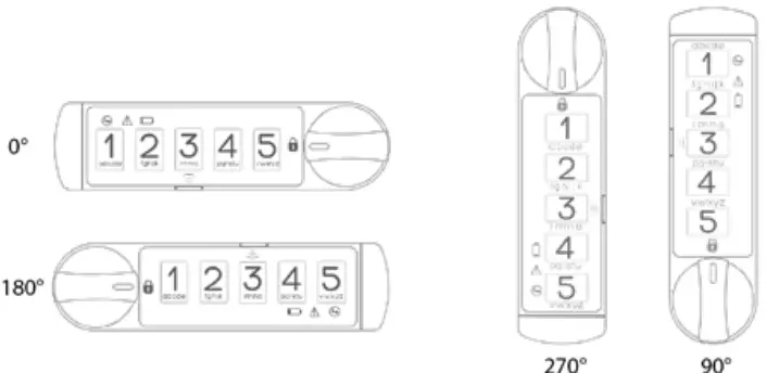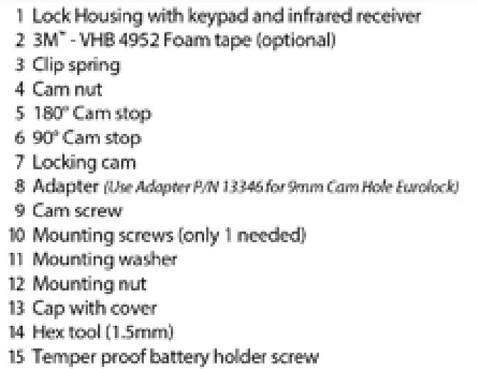 Prior to installation and insertion of the battery, the knob of the lock mechanism will be free moving. The unit hardware contains a cam stop (#6) for both 90 and 180 degrees. Select and install the desired cam stop and cam (#7). Position the cam stop so the knob rotation is clockwise or counter-clockwise as desired