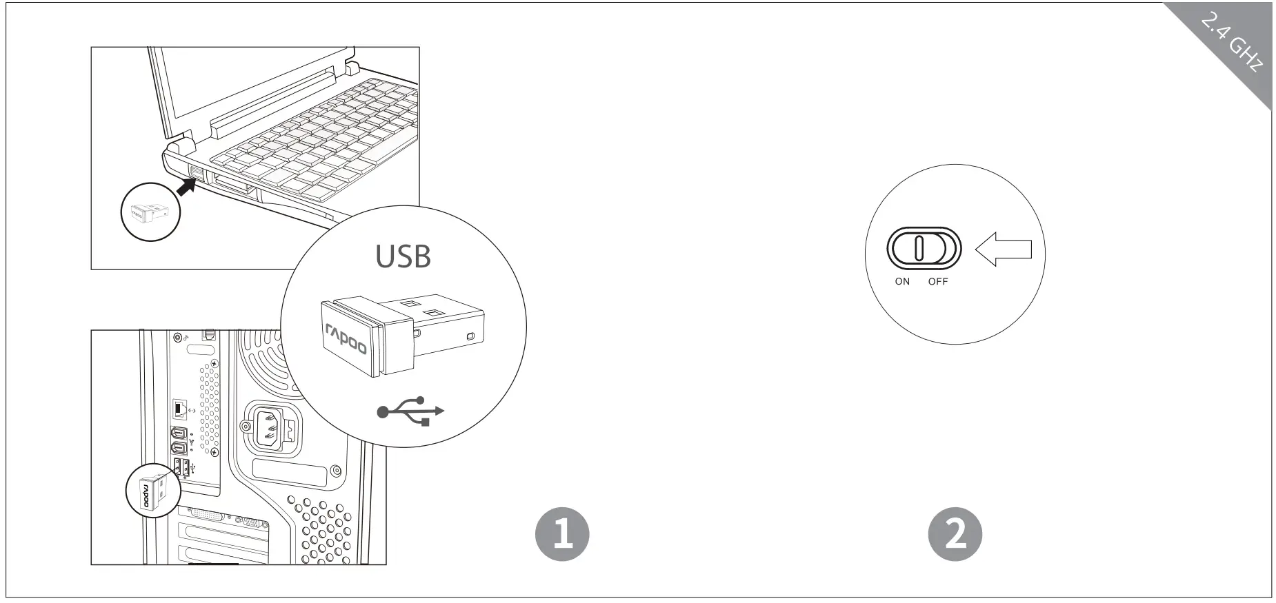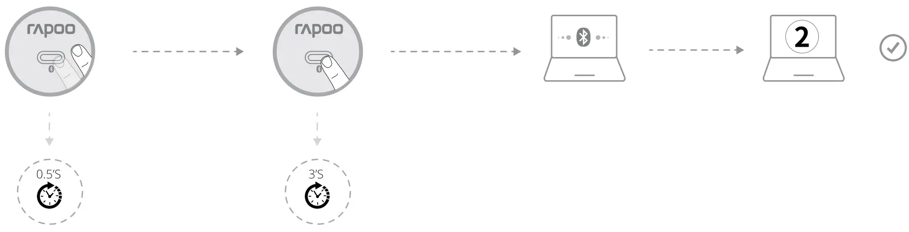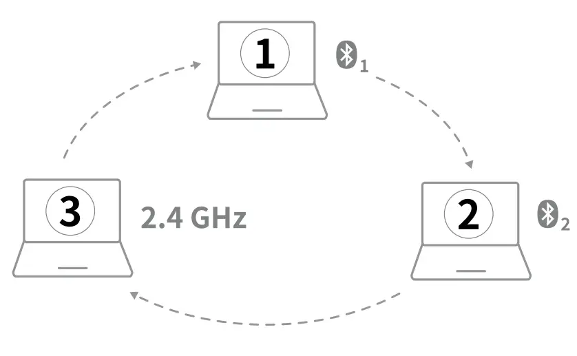 Press Bluetooth button to switch among up to 3 paired devices. The mouse connects up to 2 devices via Bluetooth and 1 via a 2.4 GHz receiver.