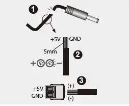 - a +5V wire and a GND (grounding) wire. Insert the exposed +5V wire and GND (grounding) wire into the 5-pin terminal block provided, which can be connected to the unit for power supply.