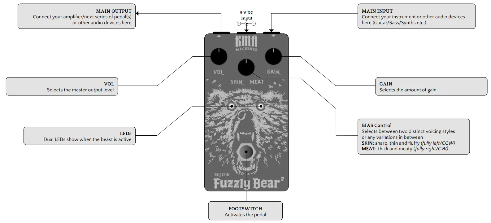 Do you crave that sludgy, chunky FuzzTortion sound? Set the GAIN control to 3 o’clock and adjust the Bias (SKIN/MEAT) control to noon, then dial in the VOL to taste. For increasingly more compressed and gated Fuzz tones, increase the BIAS control further towards the MEAT or give the FUZZLY BEAR 2 an even thicker coat of fur, by turning the GAIN further up, allowing the magic to happen when it is set fully clockwise.