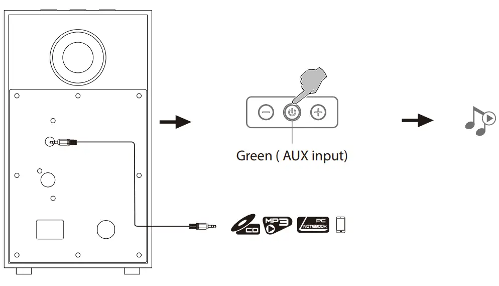 - Press the ” ” button to switch to AUX input, and the green indicator will be lit;