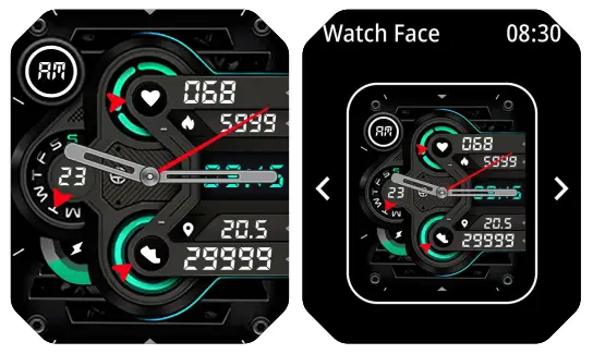 Press and hold the dial interface for 1.5 seconds to switch the dials of different styles in the watch;