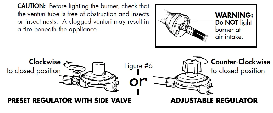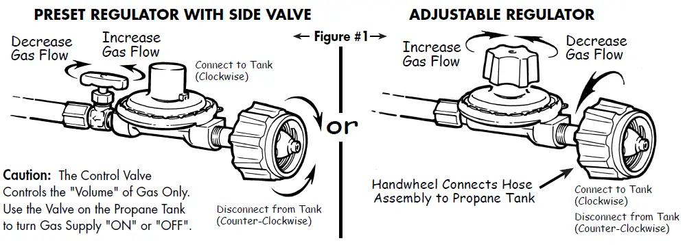 - The valve on the propane tank is the “ON/OFF” valve. When finished cooking, or in case of an emergency, turn the tank valve clockwise to the “OFF” position. Be sure to close the tank valve before disconnecting the hose. Caution – The valve on the hose and regulator assembly controls the flame intensity only. It is not an “ON/OFF” valve.