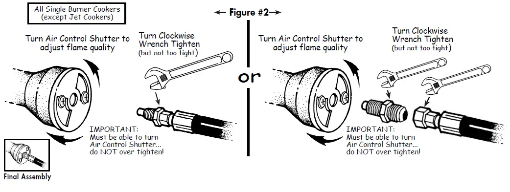 - Control frying temperature by turning the valve on the hose & regulator assembly. Constantly monitor the thermometer!