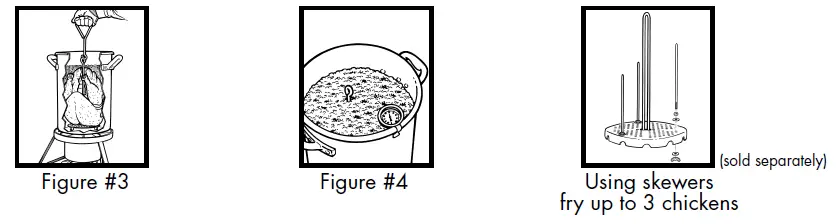 - When poultry is done, turn cooker off at the tank. Leaving pot on cooker, place grab hook through top Loop of the rack and very carefully remove rack with poultry from pot. (Figure #3)