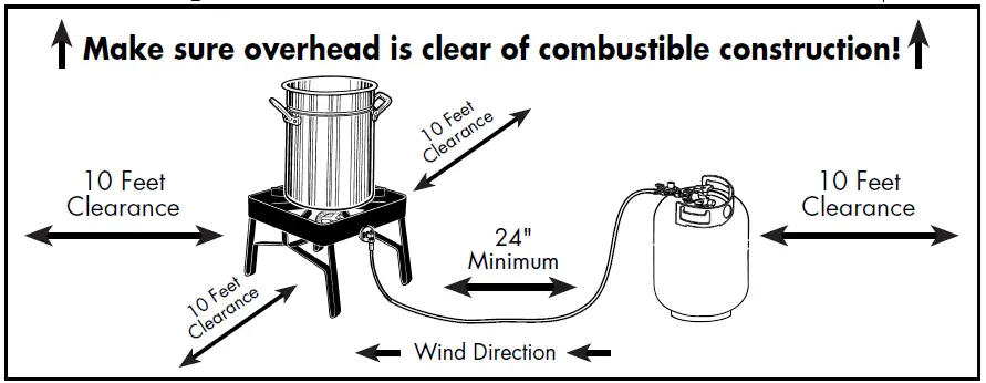 - Appliance must be in open area with at least 10 feet of clearance in all directions to nearest structure or combustible construction.