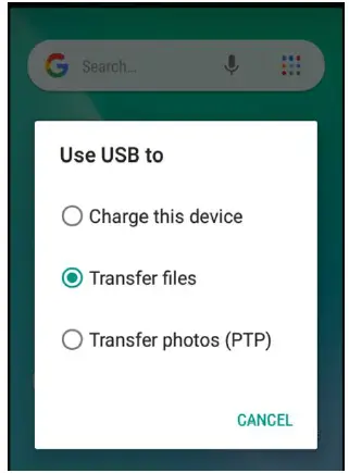 - Pulling down the notification bar, tap the Tap for more options prompt and in the new window, select Transfer files.