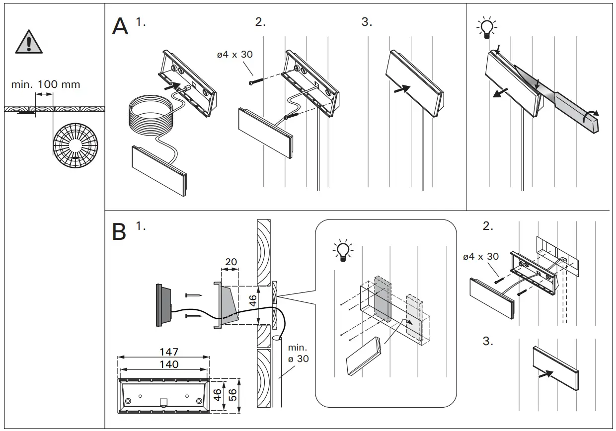 Conductor tubing (ø 30 mm) inside the wall structure allows you to thread the data cable hidden within the wall – otherwise the installation will have to be on the wall surface. We recommend you to install the control panel embedded in to the wall and far away from possible splashes.