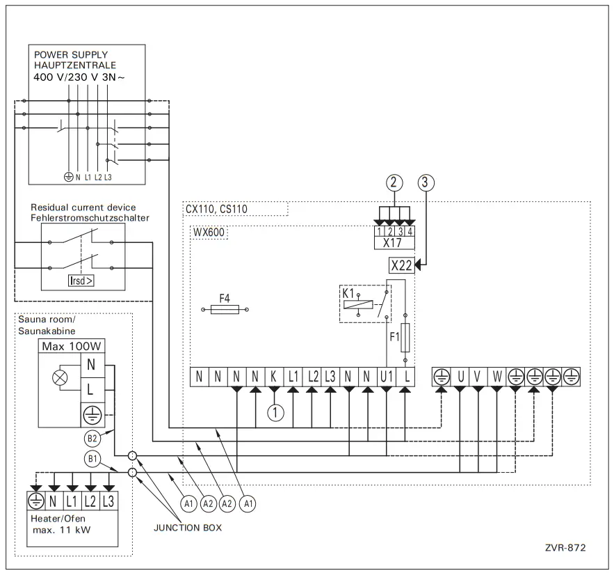 Figure 4 shows the electrical connections of the power unit. For more detailed installation instructions see the instructions for installation and use of the selected heater model.
