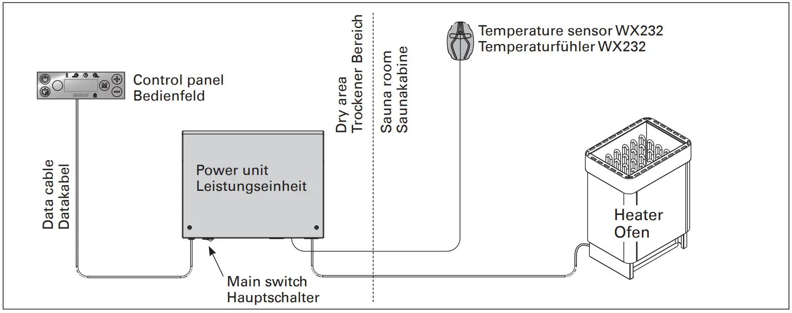 The control unit regulates the temperature in the sauna room based on information given by the sensor. The temperature sensor and the overheat protector are located in the temperature sensor box. The temperature is sensed by an NTC thermistor and the overheat protector can be reset ( 3.4.).