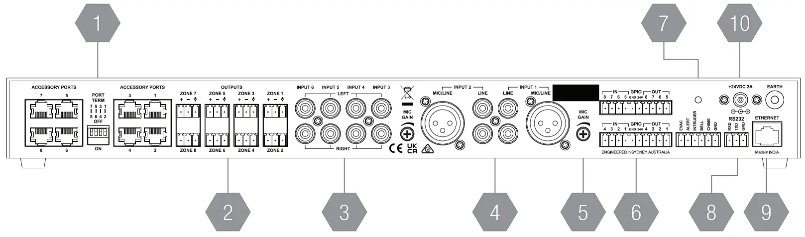 Allows connection of wall panel controllers, paging stations and audio wall panel inputs. See the full manual for wiring and setup instructions. - ZONE OUTPUTS