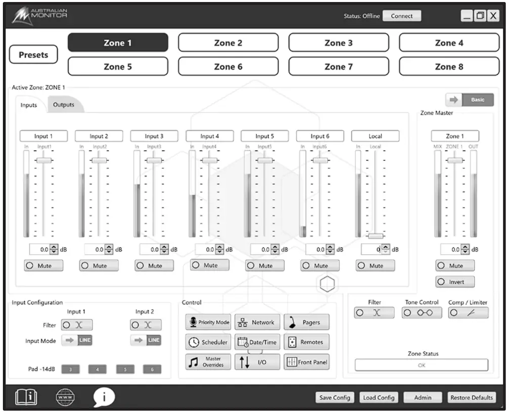 The ZONEMIX comes with a free downloadable PC application to allow advanced configuration and control of the system. The software is available from www.australianmonitor.com.au and can be accessed from the PC over the ZONEMIX USB or Ethernet connection.