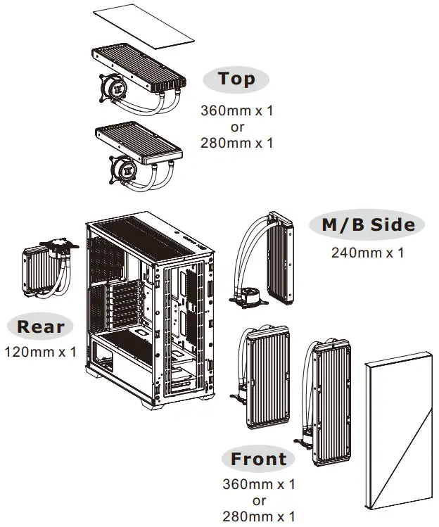 | Top | 1 x 360 mm, 1 x 240 mm, 1 x 120 mm | 1 x 280 mm, 1 x 140 mm | |
