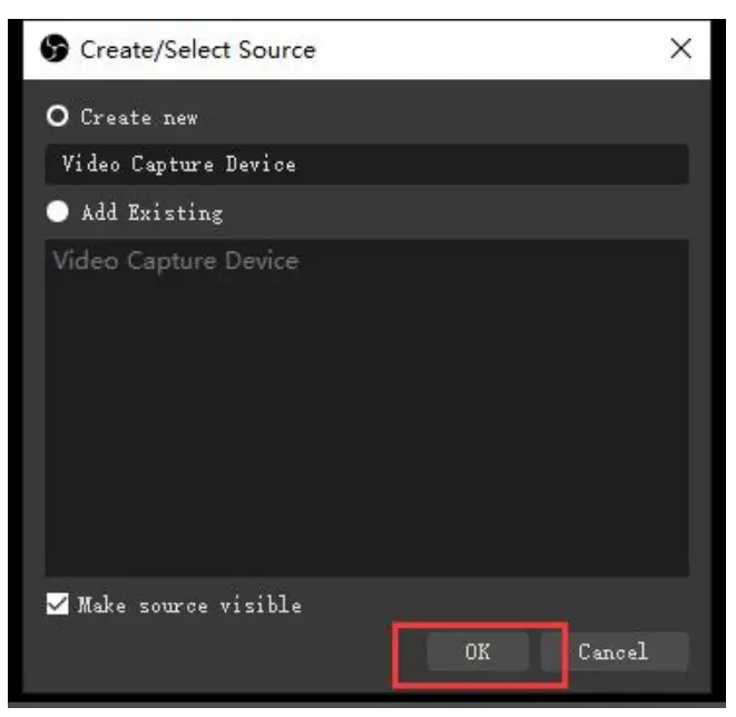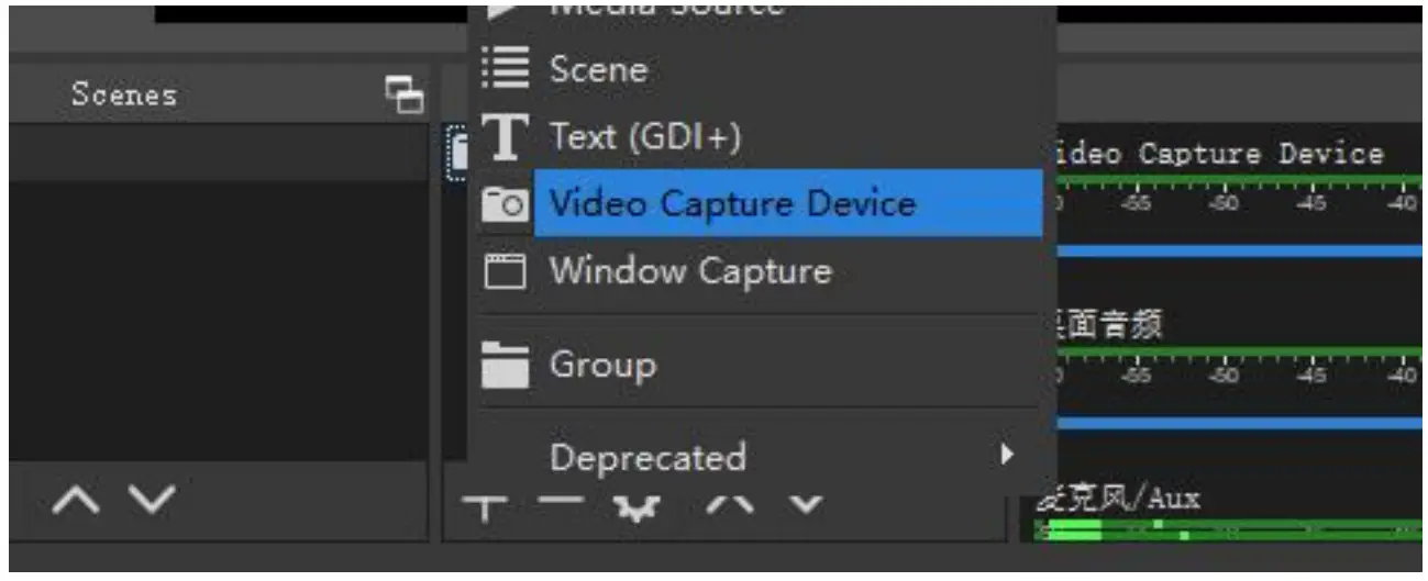 Step1. Open OBS Studio , click ”+” and select ”Video Capture Device”.