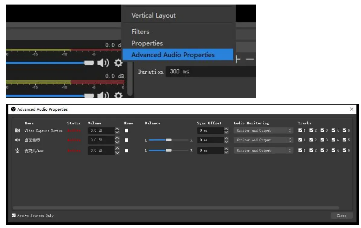 Step4. Enter “Advanced Audio properties” can change the setting about the volume, balance, audio monito ring, and Tracks etc.