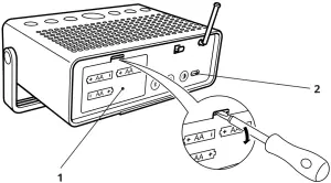 Open lid (1) and insert 3xAA Ni-MH batteries with correct polarity and/or connect USB cord into connector (2).