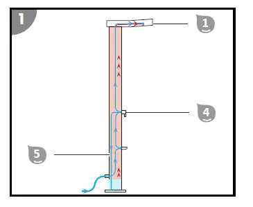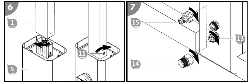 - Slide the connecting elements 3 between the tanks 5 6 and the shower head 1 upward.