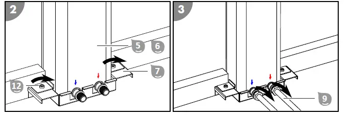 - Screw one pipe 9 onto the hot water connections (red markings) and the second pipe onto the cold water connections (blue markings) on both tanks 5 6 .