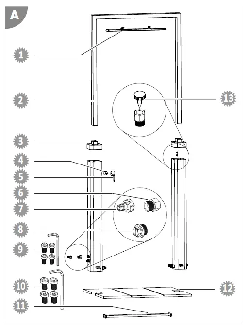 - Drain the remaining water from the tanks. Screw the drain cap 13 into the main tank and the vent valve 2 into the additional tank. The solar shower is dismantled.
