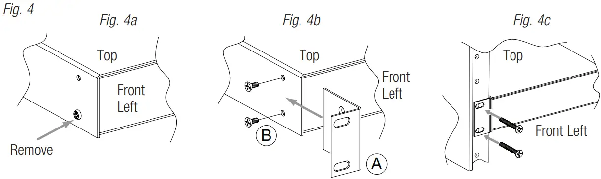 - Install mounting brackets (A) on the left and right side of rack chassis using the two (2) flat head screws (B) (included) (Fig. 4b).
