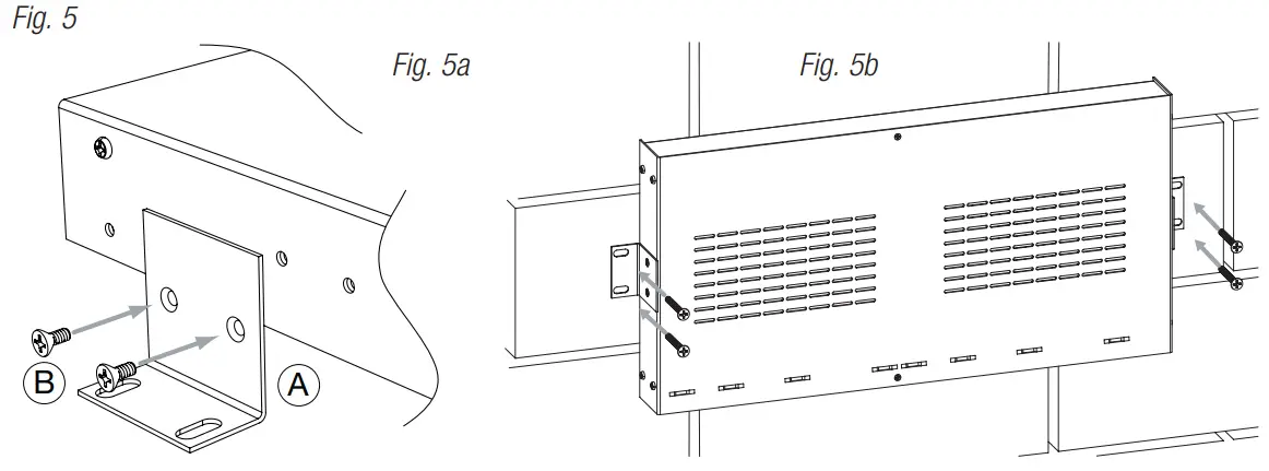 - Install mounting brackets (A) on the left and right side of rack chassis using two (2) flat head screws (B) (included) (Fig. 5a).