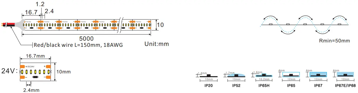 IP67E: Solid silicone extrusion, ~7% less output and 4th best color consistency, outdoor use, max length up to 50 meters.