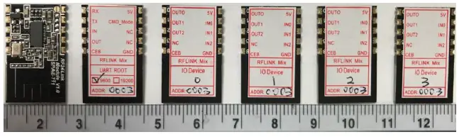 The RFLINK-Mix UART-to-IO module contains a piece of the UART ROOT end (left). Up to four IO Devices (right side of the figure below, numbered 0 to 3), both Although the appearance is the same, it can be identified by the label on the back of the ROOT or DEVICE Check the box to identify.