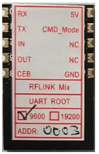 As shown in the figure below, the leftmost figure is the part side, and the others are the label side The Group Address of this group of RFLINK-UARTROOT modules is 0001, Baud rate 19200. RFLINK I2C Devices as Device 0 , Device 1,Device 2, Device 3, Group Address is 0003