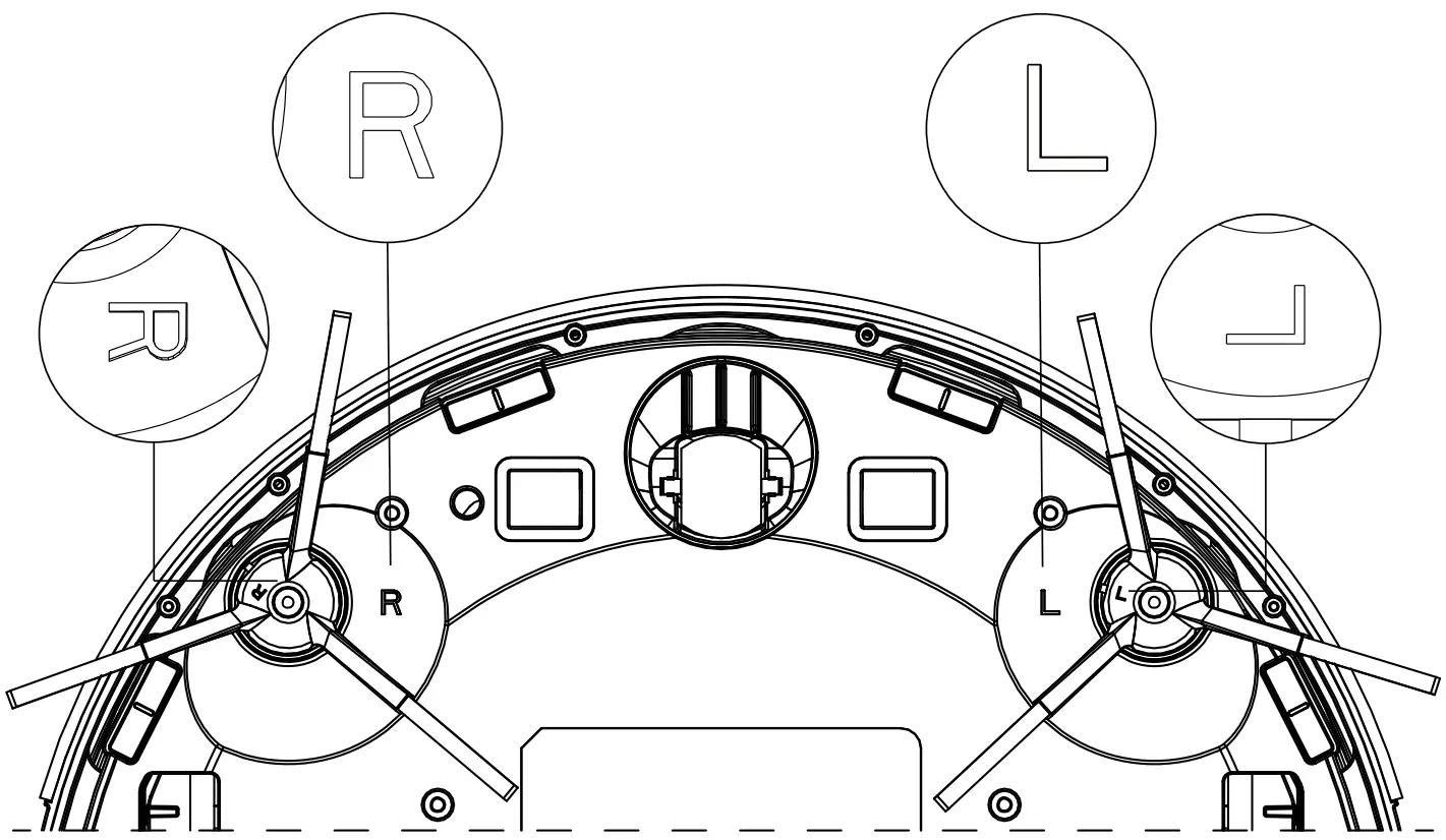 Make the left side brush and the right side brush correspond to L and R on the bottome casing, press L and R, side brushes are installed, tighten the fixing with the screws.