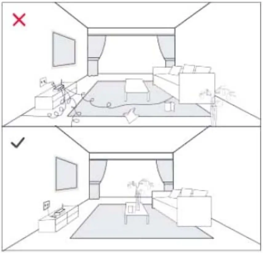 – please clear various wires (including power line of charging station) on the ground before use so as to avoid outage and damage of objects or wires when wires are dragged by the robot.