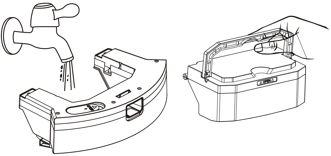 Note: please remove the dust box from the 2-in-1 water tank before filling it with water to prevent water into the dust box: Lift the handle of the dust box and take the dust box out of the 2-in-1 water tank. Then fill the water tank with water and fasten the lid. - Install the water tank:Put the dust box into the water tank, and put the hand flat.
