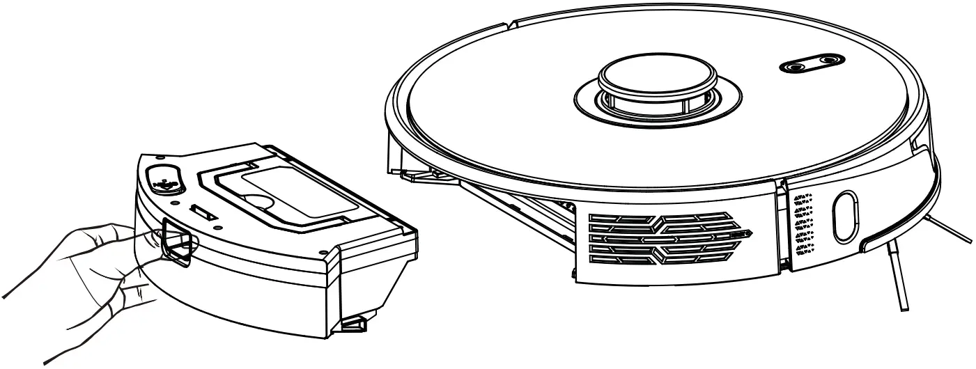The mopping bracket is installed in place when you hear a “click” sound. - Remove the water tank:When the host completes the work, press and hold the buttons on both sides in the middle of the mop bracket, remove the mop bracket backward, and clean the cloth (do not move or flip the host during work).