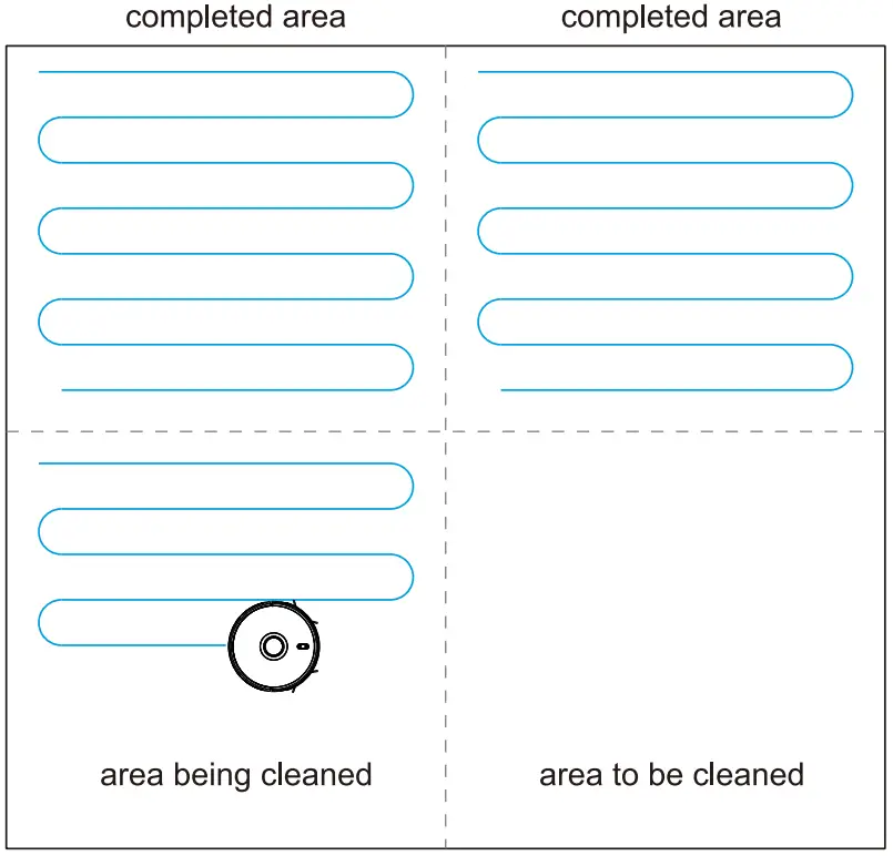 on the robot to enter this mode.The machine will automatically scan the room and generate a map, and divide the map into several zones. In each zone, robot will start edge cleaning firstly and then planning clean the whole area in a zig-zag path. The machine will complete the cleaning in each partition one by one, orderly and efficiently, full coverage and without omission. After completed the whole cleaning, the machine will automatically return to the charging station.