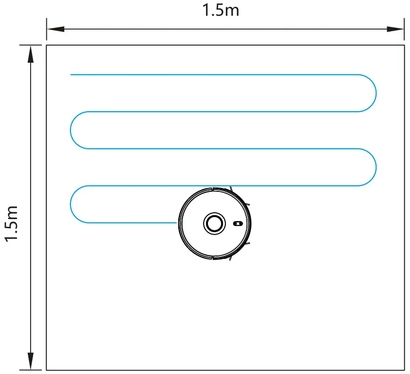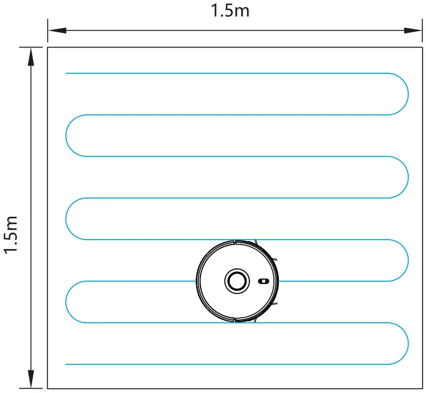 The robot will take the point of its placement as the center, start an auto cleaning in a square area of 1.5mx1 .5m: it will clean along the edge firstly, after the edge path is closed robot will start a zig-zag cleaning in this area for two times with the 3rd gear suction, and finally complete a# shape path. After completed the cleaning, the machine will automatically return to the charging station.