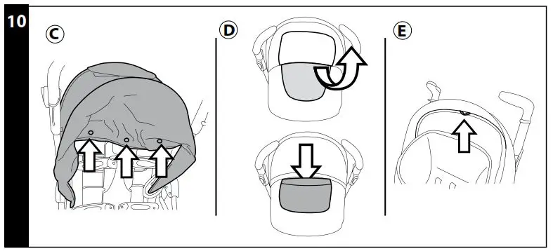• Make sure that the rain canopy does not interfere with any moving mechanism of the stroller.