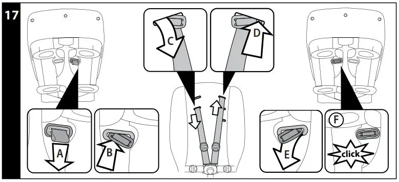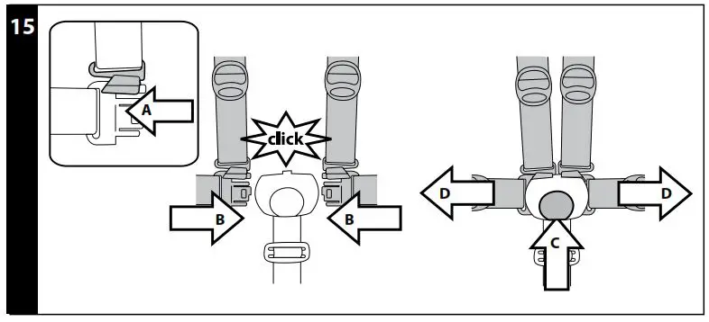 - 5-POINT SAFETY HARNESS: to fasten, insert the two buckles of the waist strap (with attached shoulder straps, arrow a) into the leg divider strap until they click into place (arrow b). To unfasten them, press the button which is situated in the centre of the fastener (arrow c) and pull the waist strap outwards (arrow d).