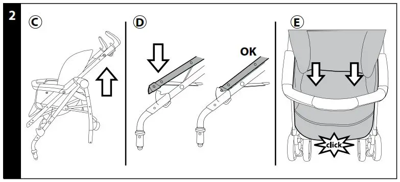 - At the same time, lift the chassis and it will open automatically (Fig.c). To make sure that the stroller is correctly open, check the two side hooks (Fig.d).If the straps are not fasten correctly, press onto the seat (fig_e) until it clicks into place.