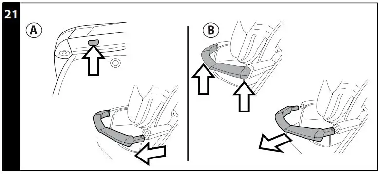 - The front bar can be opened to one side only to allow the child to get in and out of the stroller easier when he or she is older. To open the front bar, press the button under the armrest while pulling out the front bar (Fig.a). To remove the front bar, press the two buttons under the armrests while pulling out the front bar (Fig.b).