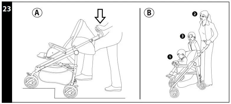 stroller, then place the smaller child in the seat and fasten the safety harness (1). Hold the handlebars (2) and have the second child stand on the ledge (3).- Never leave your children unattended.
