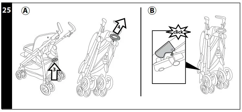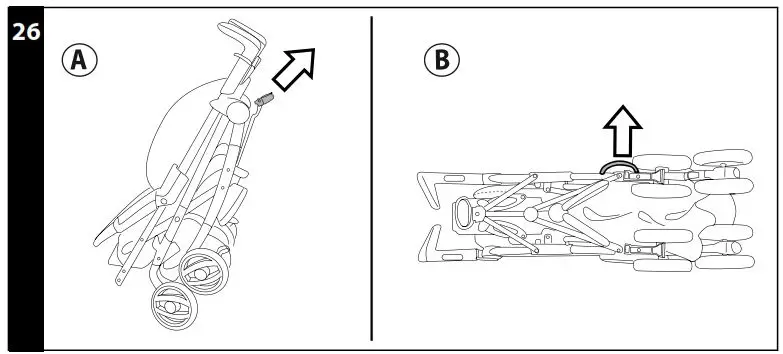 - Hold the central handlebar and pull it upwards until the stroller folds up (fig_a). Check the correct closure of the chassis from the safety hook (fig_b). When folded, the chassis will stand upright .