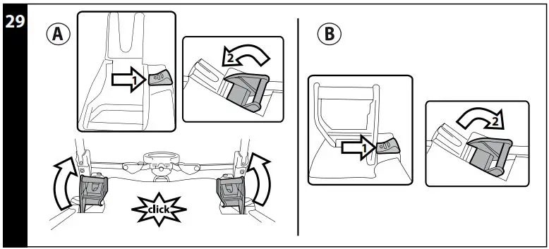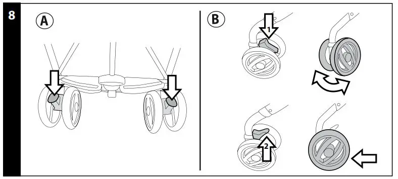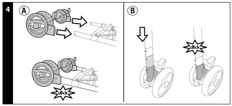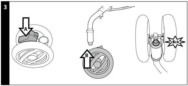 - ASSEMBLING: to mount the front wheels, lower lever A and slip wheel B on until it clicks into place.