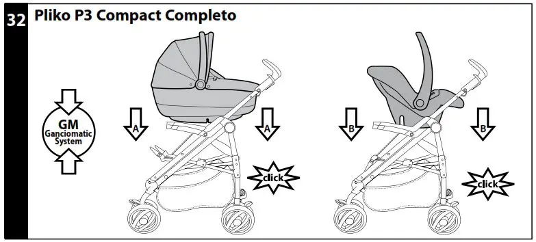 Ganciomatic System Ganciomatic is the quick and practical system that allows you to attach the Navetta XL or the Primo Viaggio Tri-Fix, which are also equipped with the Ganciomatic system, to the Pliko P3 in stroller format, thanks to its Ganciomatic connectors.
