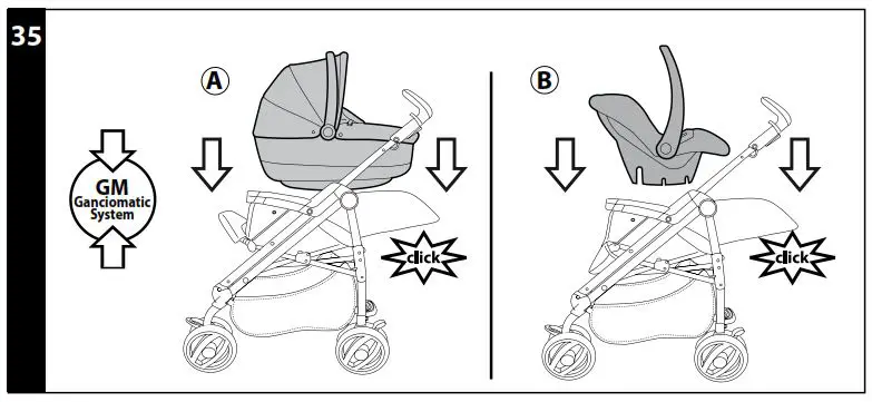 - THE STROLLER GANCIOMATIC FASTENERS: to raise the Ganciomatic connectors on the stroller, lift the fabric covering at the corners of the seat, pull the lever outwards and at the same time swivel the two connectors upwards until they click (fig_a).To lower the stroller Ganciomatic fasteners, pull the lever outwards and at the same time rotate the fasteners downwards (fig_b).