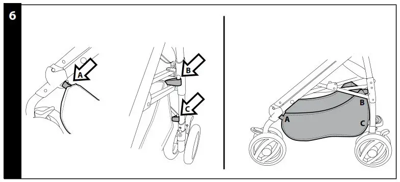 - BASKET: to mount the basket, slip the loops over the front hooks A and rear hooks B and C. The figure shows the attached basket.