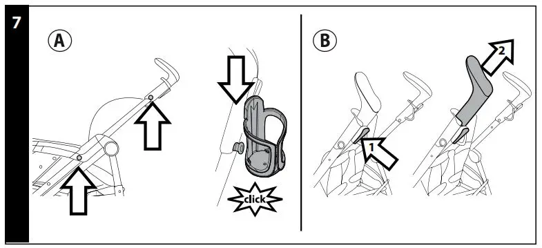 - CUP HOLDER :It can be applied on the 4 knobs on the chassis. Two are on the left or right side of the handle and two on the sides of the pushchair’s chassis, at the height of the bumper, on the right or left . To apply the cup holder, attach it and press until it clicks into place (Fig. a).