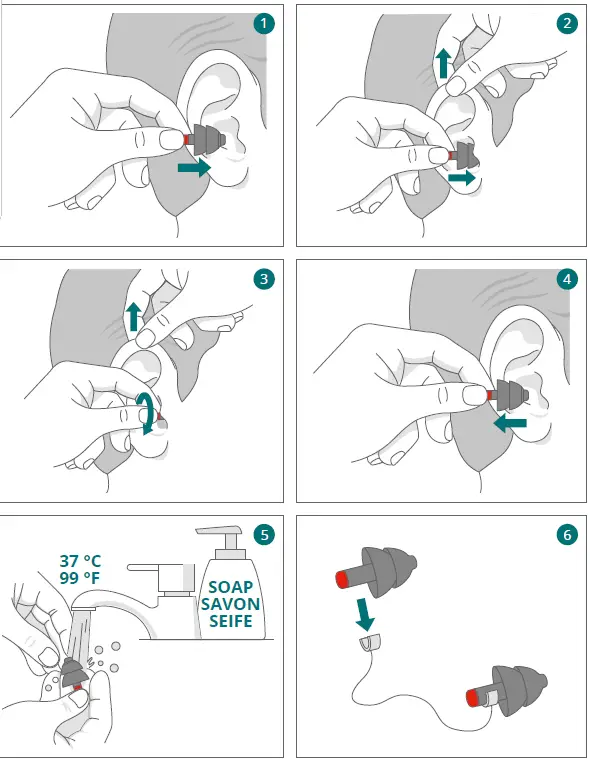 The hearing protector is intended to protect the wearer from hazardous noise levels. The wearer should ensure that the earplugs are fitted, adjusted and maintained in accordance with this Instruction Manual. Any other uses are not intended and therefore not allowed. Always wear the earplugs when in a noisy environment, without interruption. Slightly pull up your ear and with your other hand insert the earplug into the ear, until the protector fits snugly. Do not place the earplug too deep in the ear. Improper fit, improper use or failure to follow the instructions of this device will decrease noise reduction effectiveness, increase the risk of hearing damage and affect the lifespan of the reusable earplugs. Alpine Hearing Protection is not liable for any damage arising from misuse. Check the working order of the earplugs regularly and store them in the original, clean packaging. Clean the earplugs regularly with mild soap and lukewarm water. Dry off after cleaning. The reusable earplugs can be used approximately 100 times. Sudden or rapid removal of hearing protection may cause damage to the eardrum. Do not remove plugs from the ear by pulling the connecting cord. Do not use a connecting cord if there is a chance of getting entangled. When this device is worn as directed, the level of noise entering a person’s ear is approximated by the differences between the A-weighted environmental noise level and the lesser and greater NRRs. Caution: For predominantly low frequency noise environments in which the difference in the measured C-weighted and A-weighted noise levels (dBCdBA) exceeds 3 dB, the user is directed to the enclosed graph of the variability of noise reduction with noise spectra to determine the level of protection. This product may be adversely affected by certain chemical substances. Further information should be sought from the manufacturer. Hereby, Alpine Hearing Protection, declares that the hearing protector SleepSoft is in compliance with the PPE regulation (EU) 2016/425. The full text of the EU Declaration of Conformity is available at the following internet address: www.alpine.eu/doc
