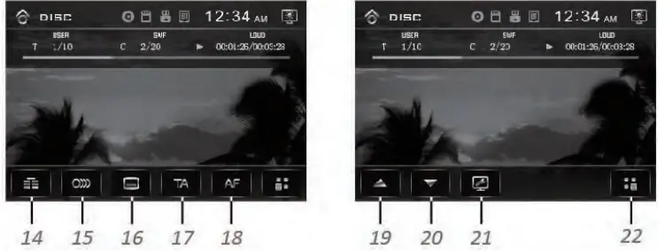 DISC, USB, SD, AUX IN, AV IN and BT. - Volume KNOB / SELECT BUTTON